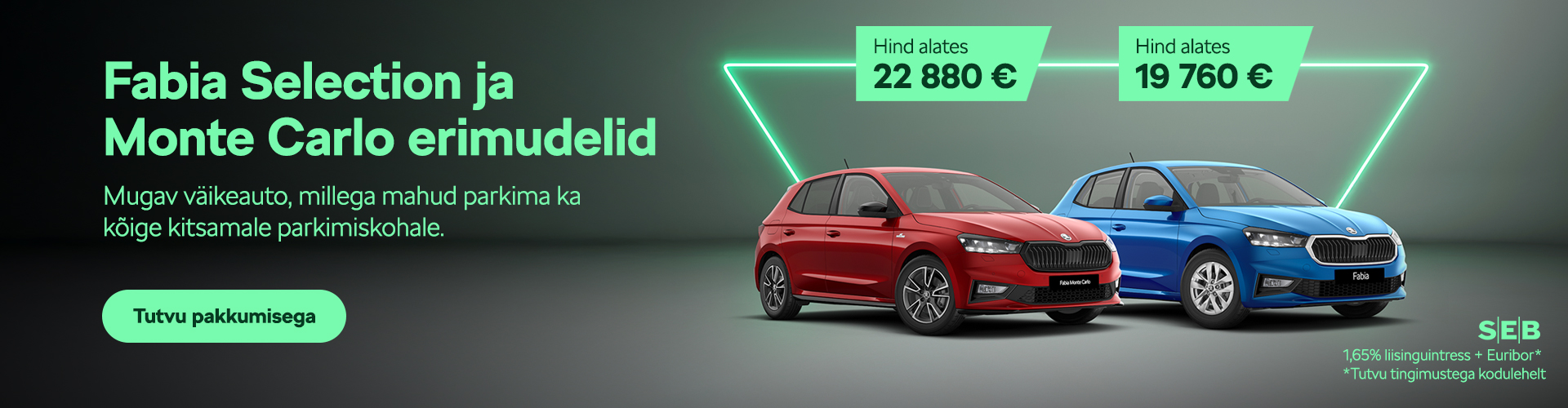 Hind alates 19 760 €. Pakkumine kehtib Škoda Fabia Selection ja Monte Carlo erimudelitele! Eripakkumine kehtib 02.01.2026-30.06.2026.