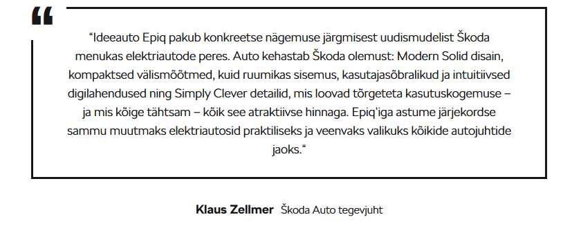 Škoda Epiq on kompaktne ja nutikas täiselektriline linnamaastur, mis toob ellu Modern Solid disainifilosoofia. 4,1 m pikkune auto mahutab viis inimest ja 475 l pagasi, sobides nii linnasõitudeks kui nädalavahetuse retkedeks. Minimalistlik stiil kohtub praktilisusega: kašmiirmatt värv, Tech-Deck ninaosa ja T-kujulised LED-tuled. Hinnatase on prognoosi järgi sarnane Kamiq’iga, ent Epiq pakub kuni 425 km sõiduulatust, muutes elektrimobiilsuse varasemast taskukohasemaks.